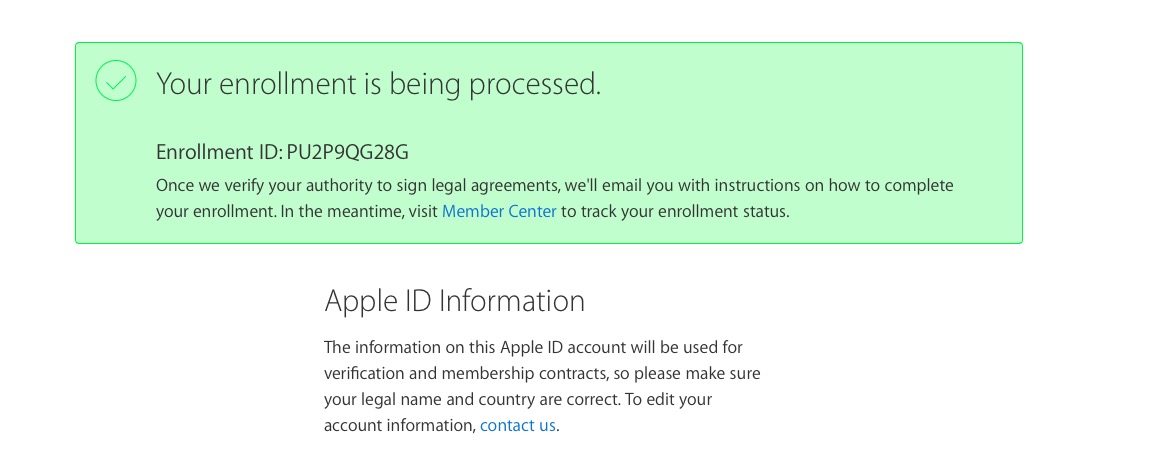 注 :填写完资料后2-3天,苹果官方会打微信给企业法人去核实资料 ,当信息核实后,苹果那边审核资料通过了,则到了填写支付的信用卡资料的流程.